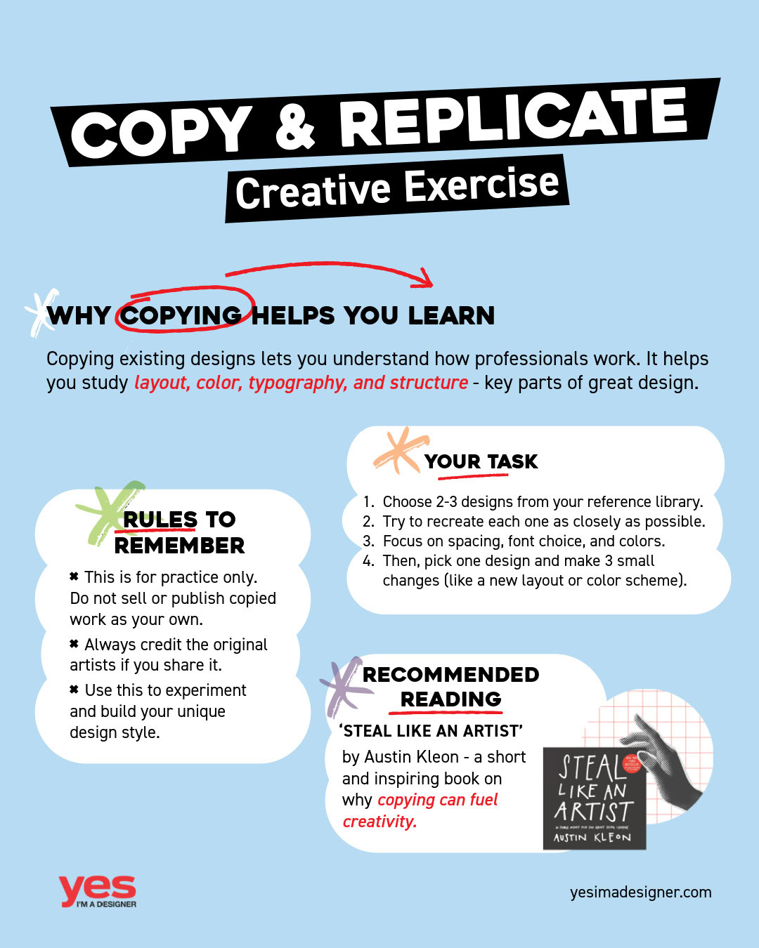 Once you’re actively building a reference library of designs you love (and by the way, you should never stop this step!) It's time to start replicating that artwork. YES! That’s right, copying can be a powerful learning tool. When done with the right intentions, it helps you understand how great design works and strengthens your technical and creative skills.