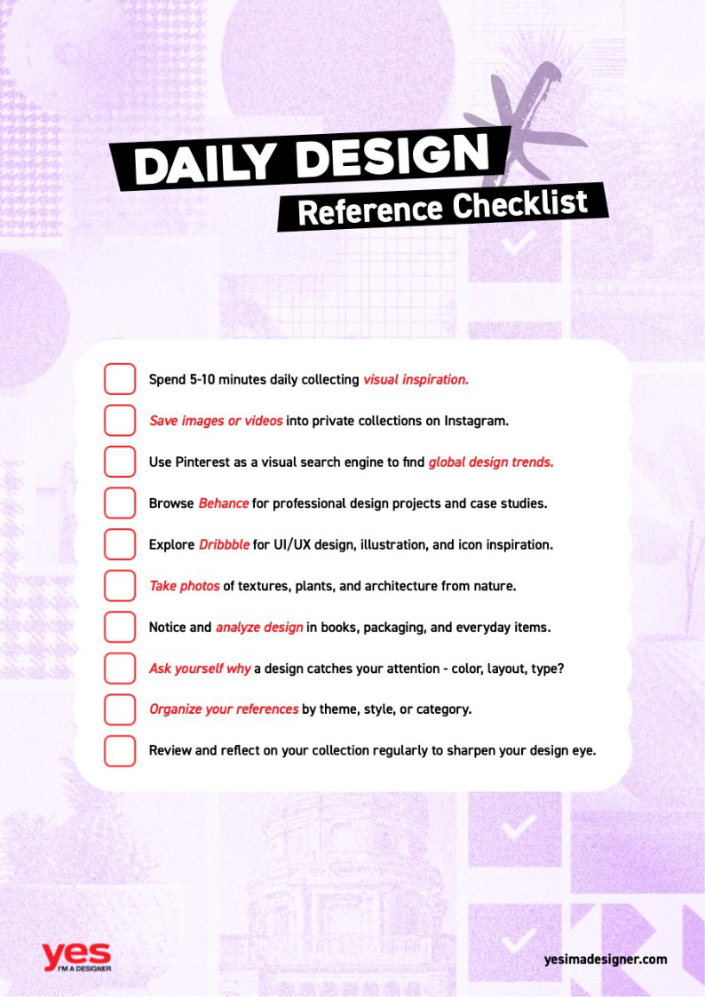 If you're passionate about design, this habit should come naturally. Spend a little as 5–10 minutes a day collecting and curating your own reference library. The more time you invest in studying and analyzing great design, the sharper your creative eye will become.